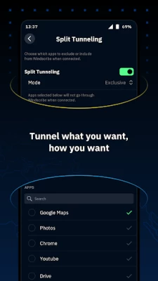 • Split Tunneling - choose which apps should go over the VPN tunnel.