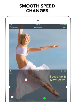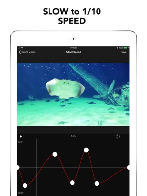 Speed up or slow down sections of video with FREE saving and NO WATERMARK! Supports portrait or landscape operation (on iPad), corrected audio pitch and unrestricted video length.
