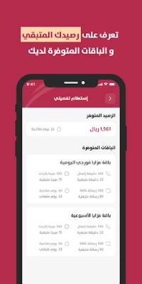 هذا التطبيق يمكنك من الاستفادة من العديد من الخدمات٫ والتي تشمل الاستعلام عن الرصيد الأساسي والباقات التي تم اشتراكك فيها٫ كما يمكنك من الاشتراك في أي من الباقات المتاحة.